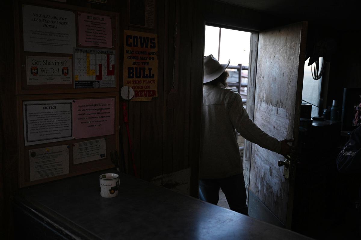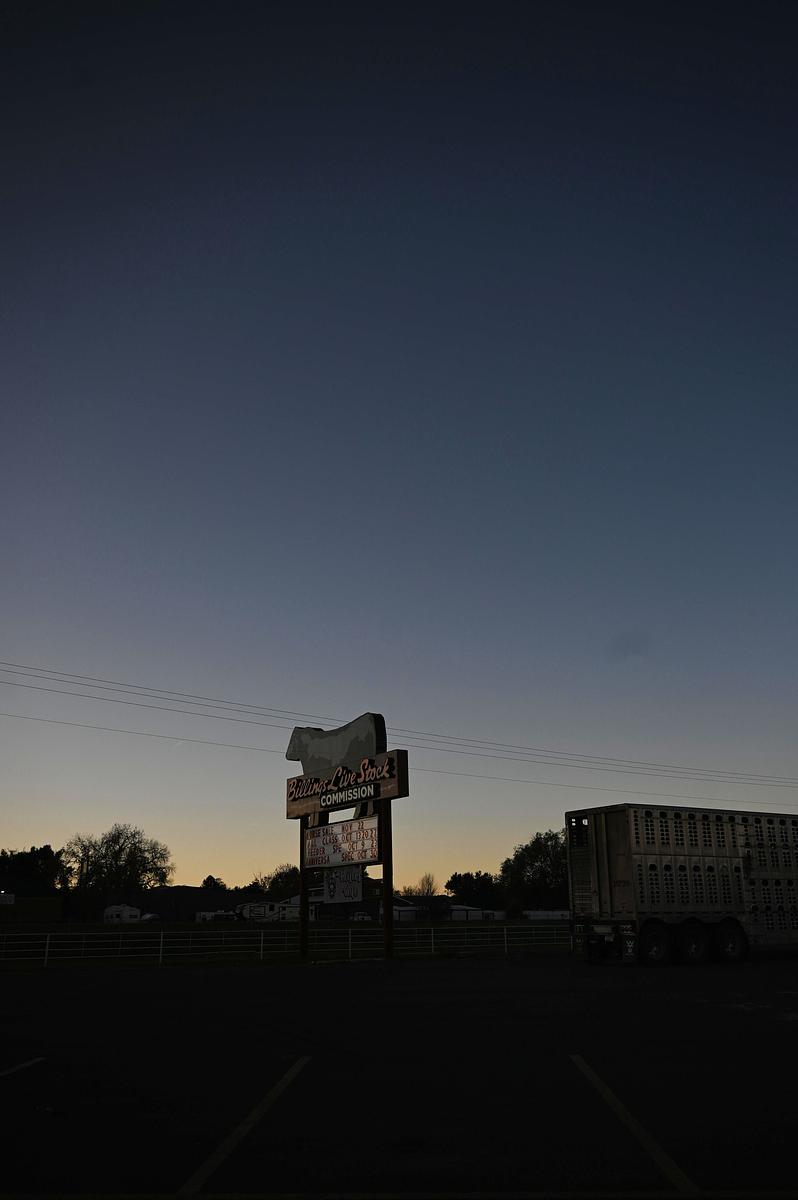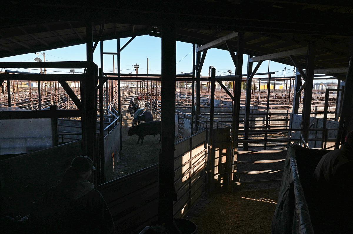 Auction workers shuffle into a small, dusty building where a TV plays reruns of Western classics. They slide into chaps, shrug on well-loved Carhartt jackets, take final swigs of coffee and punch their time cards before venturing toward their horses. Outside, strands of sunlight warm the dozens of pens that make up the Billings Livestock Commission’s cattle yard.