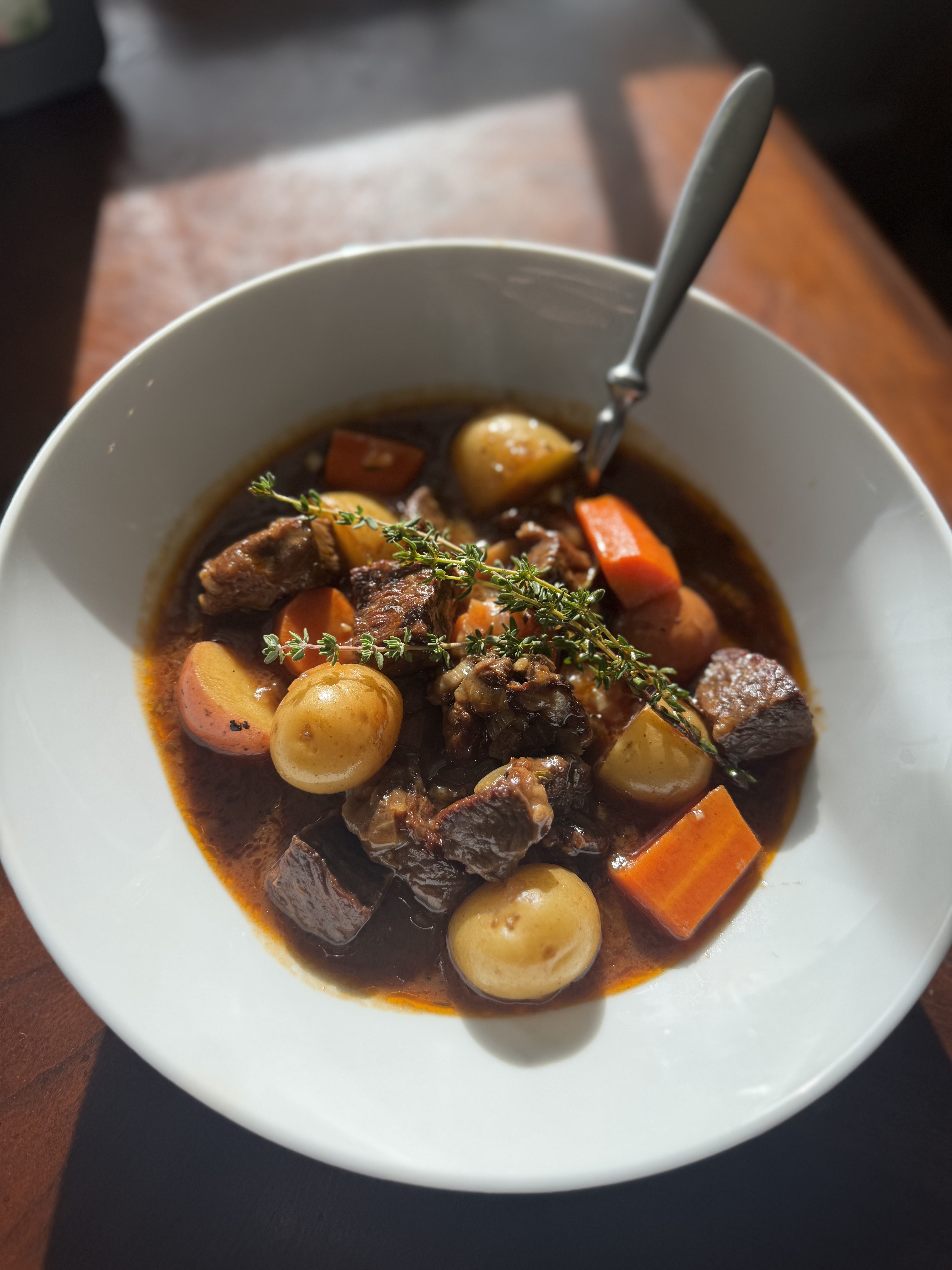 Remove the stew from the oven, taste for seasoning, and add salt and/or pepper to taste. Also check the texture of the meat, potatoes and carrots. If you want a bit more tenderness, put it back in the oven for another half-hour. Remove the thyme springs and bay leaf before serving.