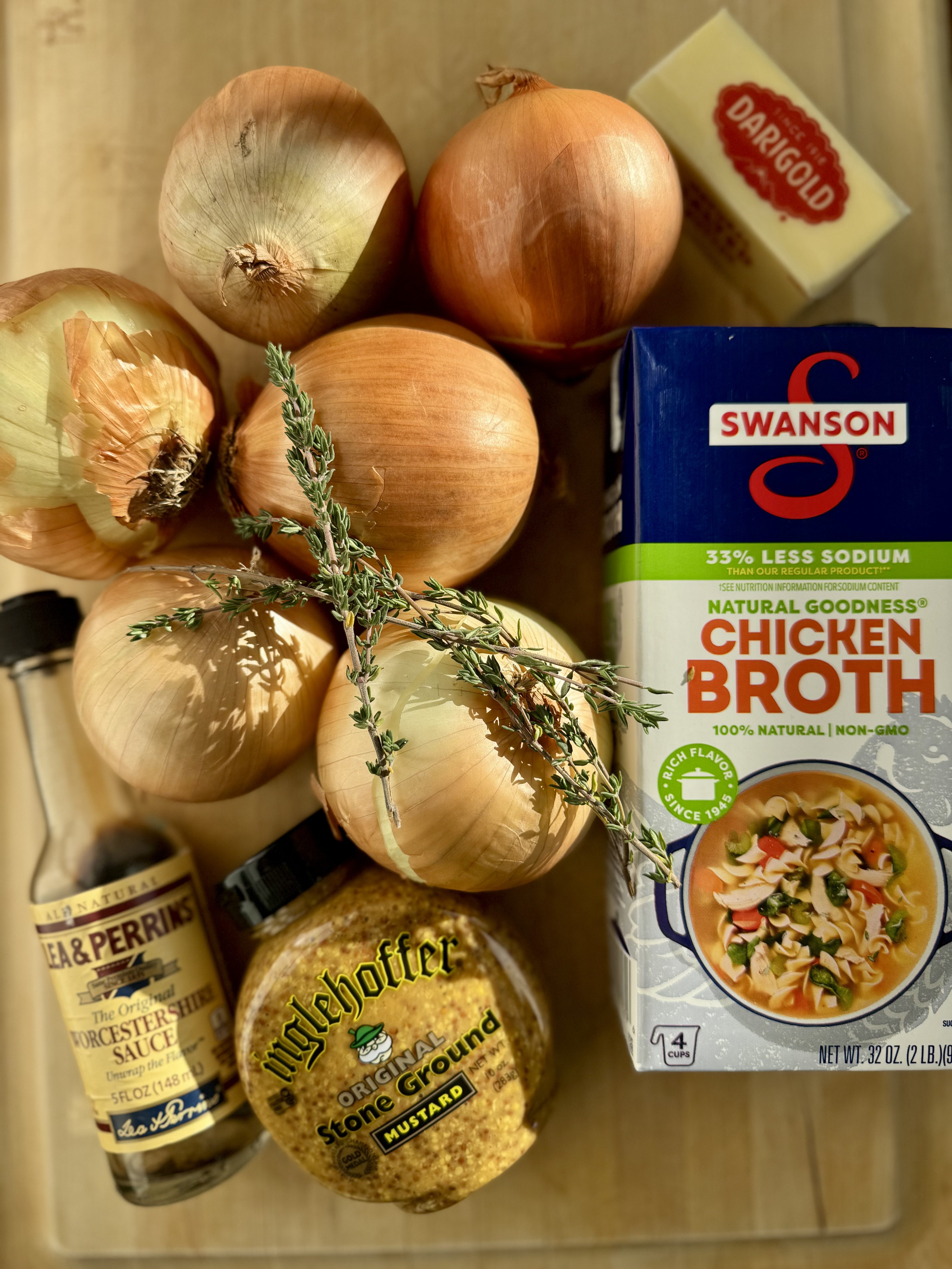 Once the onions are caramelized, add your minced garlic, thyme and flour, and stir everything together. Cook this mixture for about two minutes before adding the wine. The wine will help you scrape off any browned bits that are still stuck to the pan. Now add your chicken broth, continue scraping bits off the pan, and stir well to pull the flour off the onions, thereby starting the thickening process.