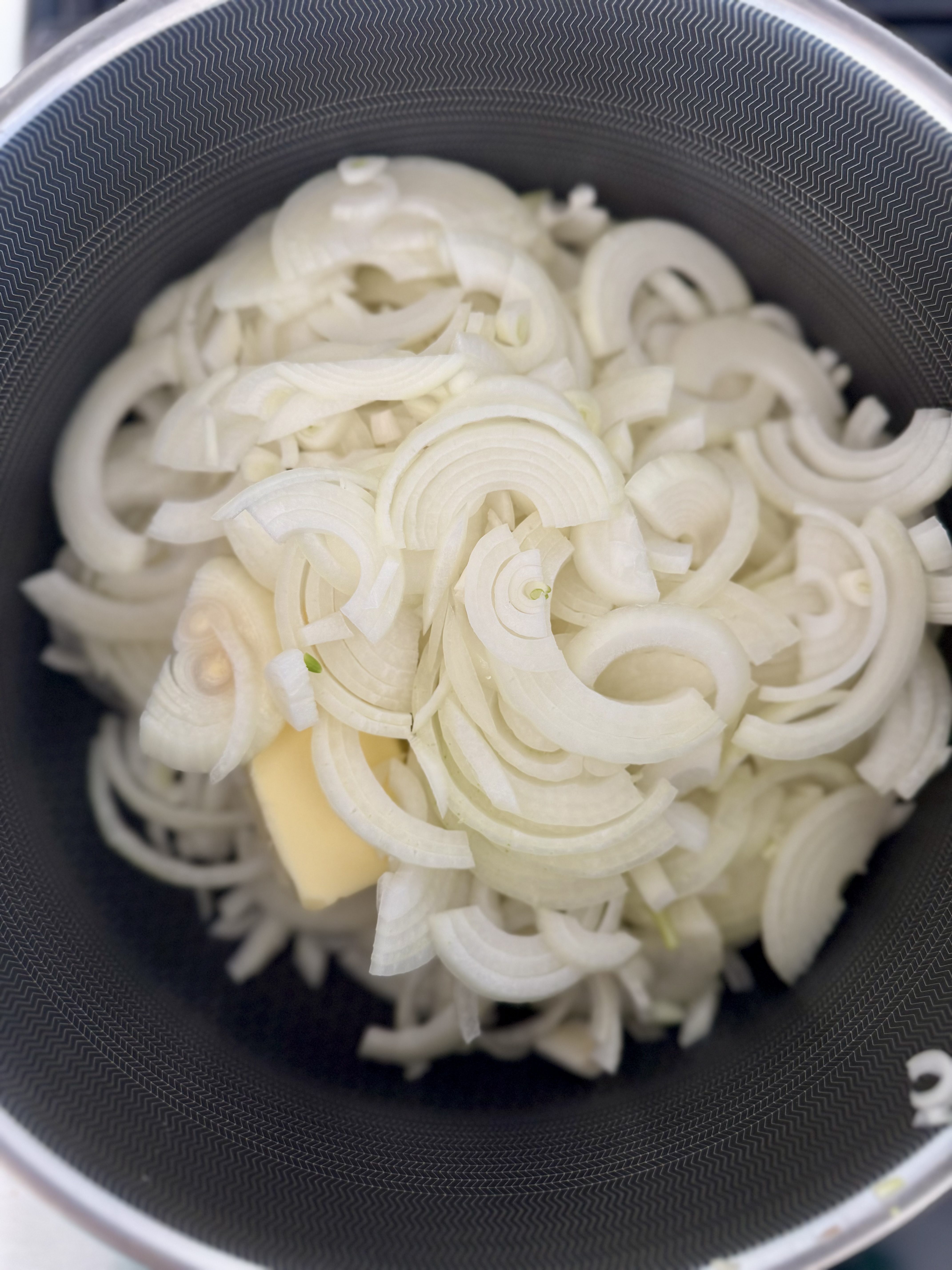 Slice the onions in half and peel the exteriors. With the cut side down, slice across them to produce strips no more than 1/4-inch thick. Preheat a large sauté pan on medium heat. Add the butter and onions. Stir to coat and spread evenly in the pan.