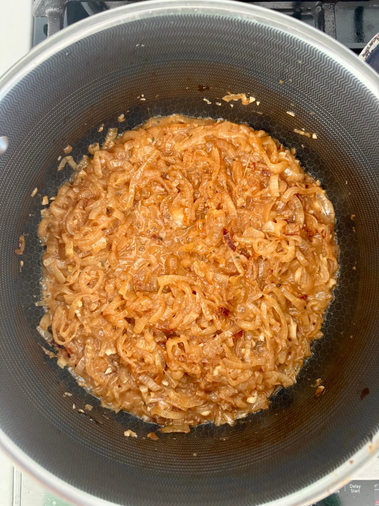 Onion gravy has been further refined by other countries and cultures, with French techniques having the biggest impact. The French thickening process — using a roux coupled with slow caramelization — has its fingerprints all over this recipe. Eventually, onion gravy has evolved to the point at which the recipe requires no meat drippings at all, which is what you have here.