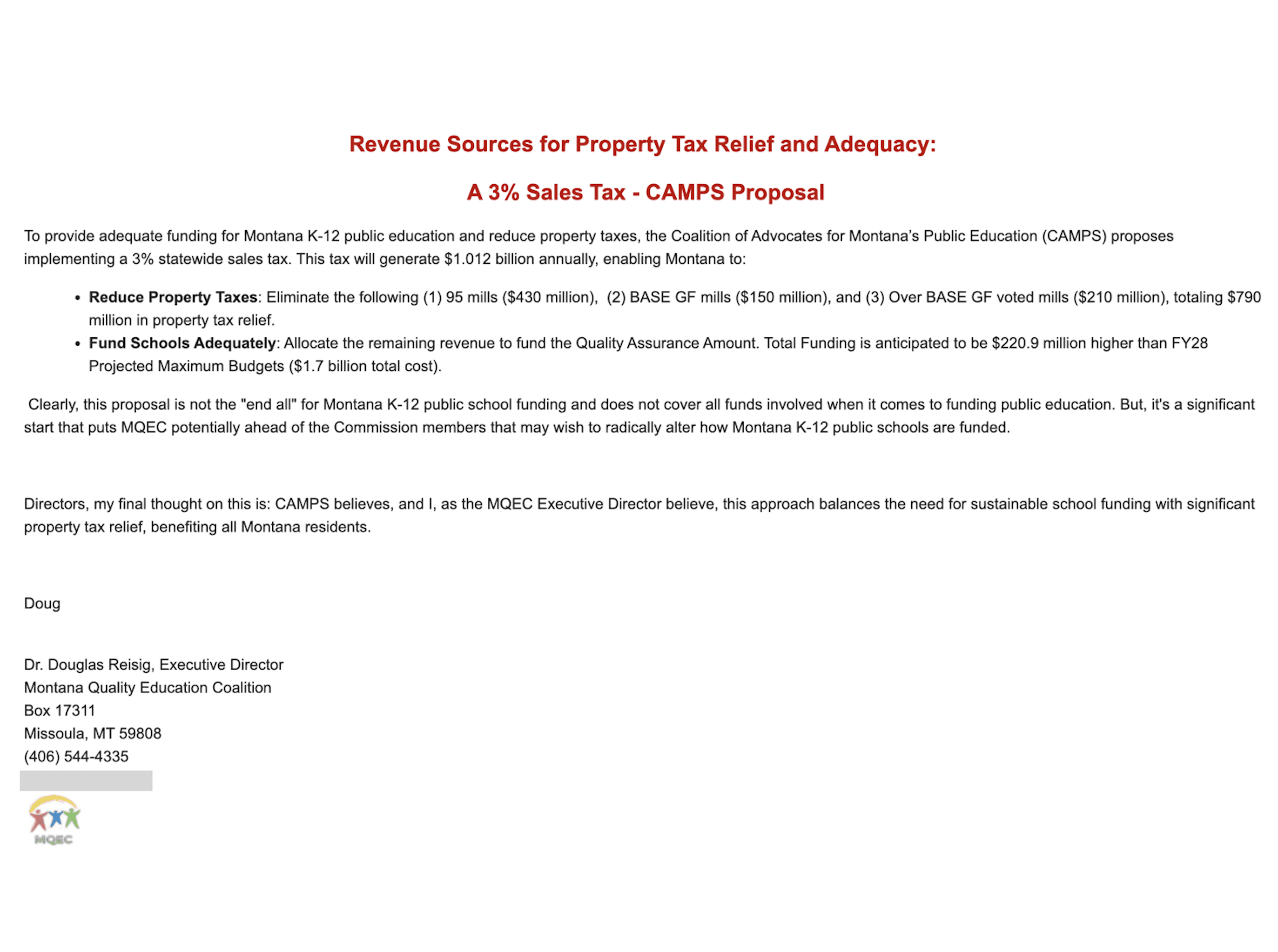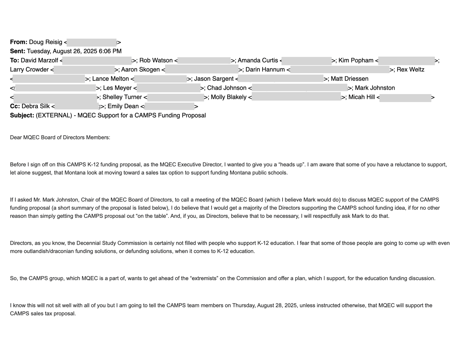 “I fear that some of those people are going to come up with even more outlandish/draconian funding solutions, or defunding solutions, when it comes to K-12 education,” Reisig wrote. “So, the [Coalition of Advocates for Montana Public Schools] group, which MQEC is a part of, wants to get ahead of the ‘extremists’ on the Commission and offer a plan, which I support, for the education funding discussion.”