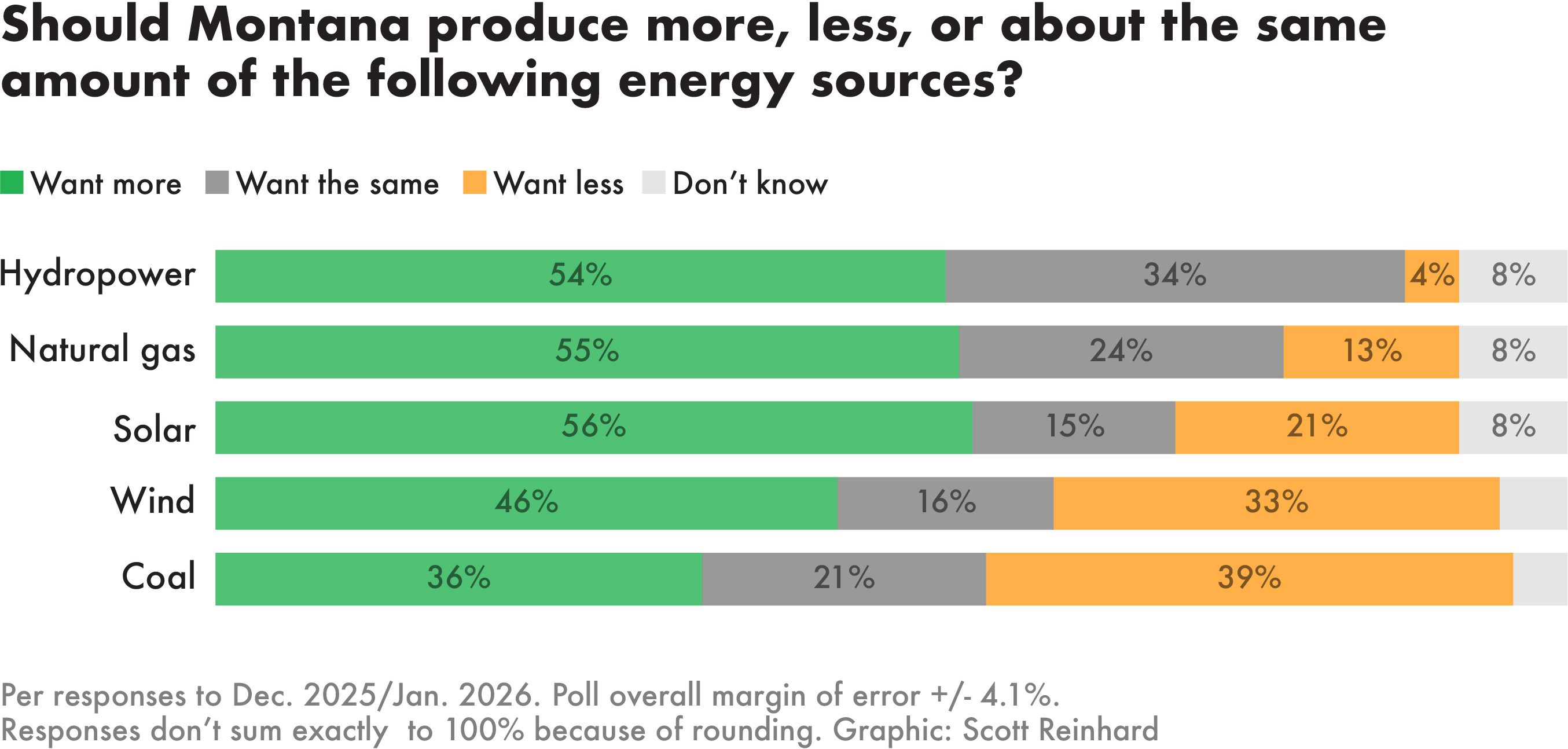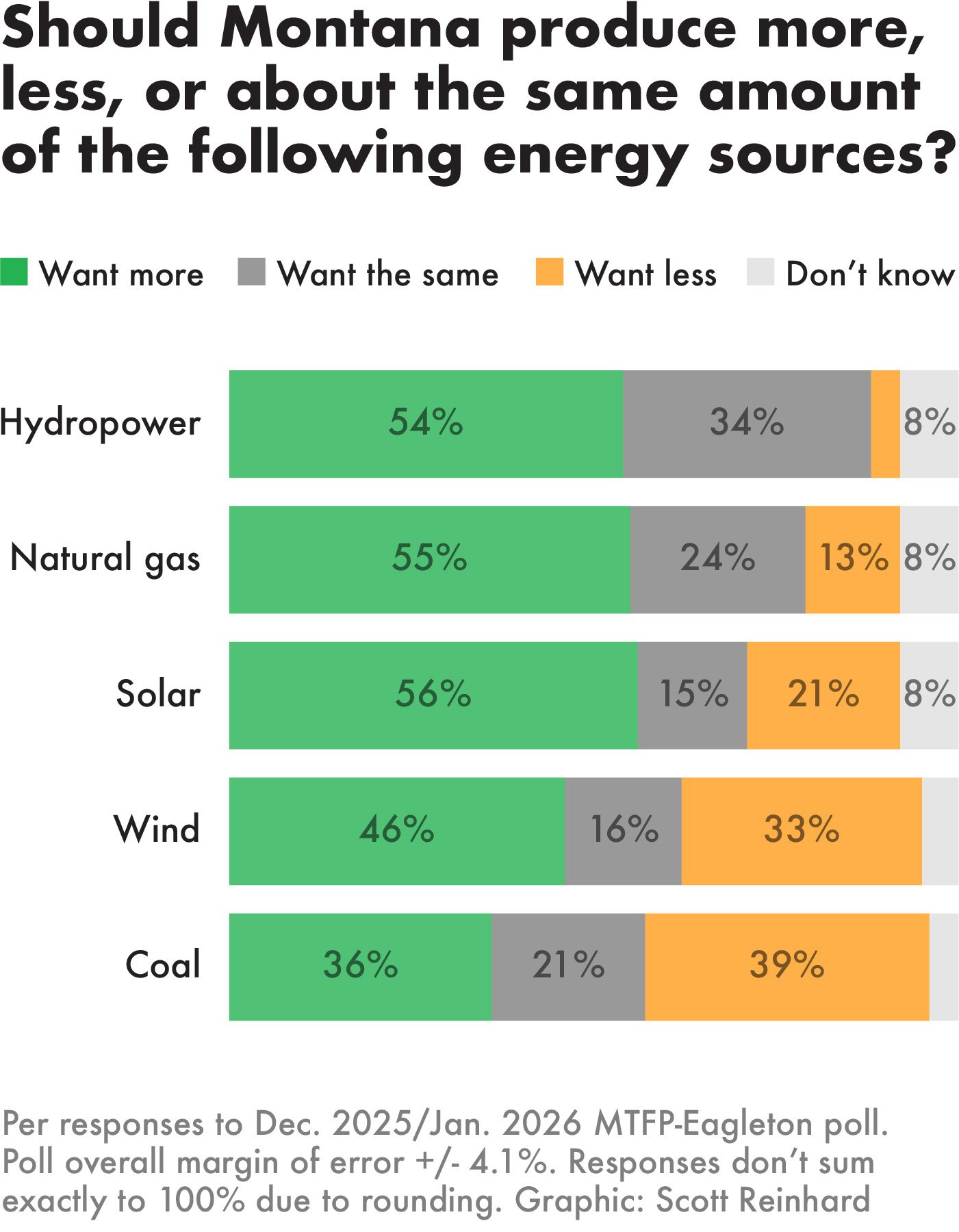 Solar and natural gas power make up a small share of the state’s energy mix, but Montanans are bullish on generating more electricity with them. Additional power from coal plants and wind farms proved to be less popular among poll respondents, with roughly one-third saying they would prefer less electricity from these sources.