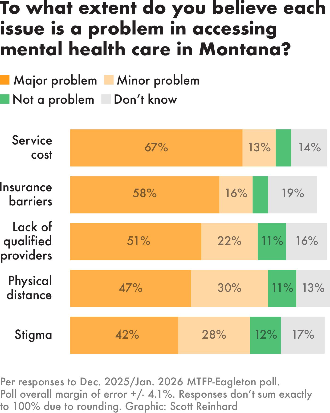 Montana voters named cost as a major perceived barrier to mental health care access. Fewer respondents rated physical distance and stigma as a significant hurdle.