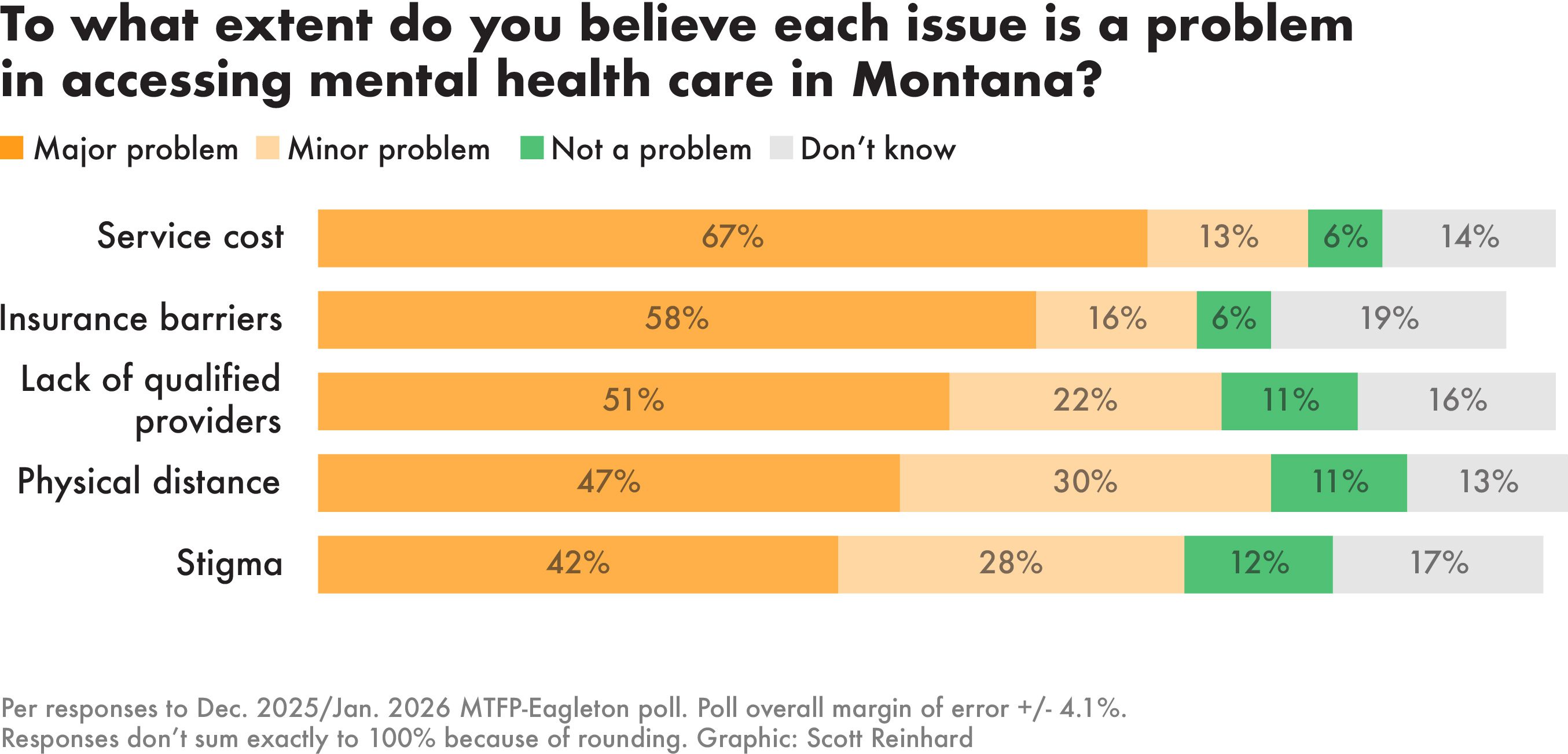 According to a new Montana Free Press-Eagleton Poll, conducted in late 2025 and early 2026, 67% of respondents cited “cost of services” as a major problem when it comes to accessing care. A smaller share, 42%, cited the stigma associated with receiving care as a major problem, while 47% said the same about the travel distance necessary to access services.