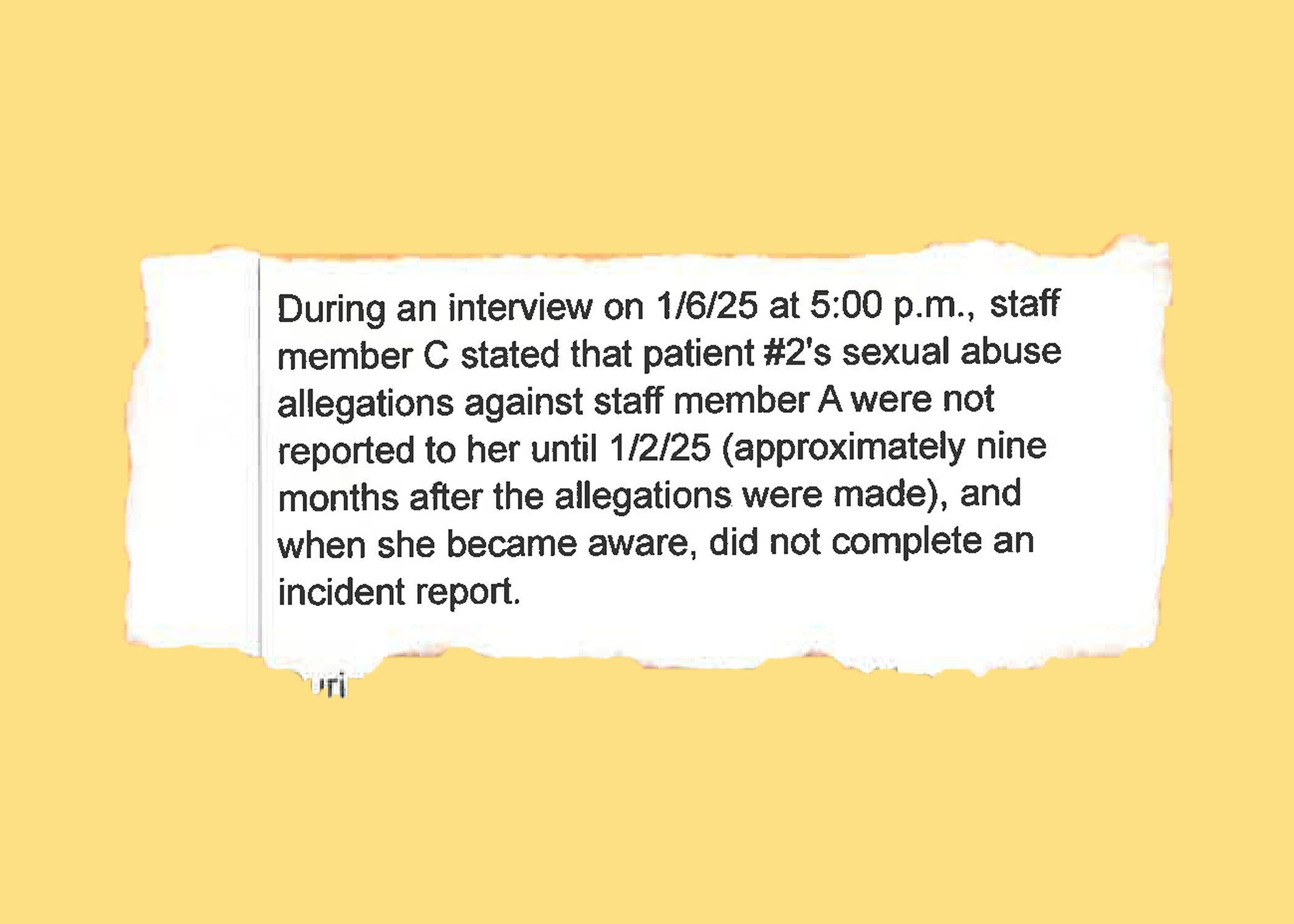 “Review of a facility email from staff member C to staff member W, dated 1/2/25 at 4:15 p.m., confirmed that allegations of sexual abuse made by patient #2 against staff member A around April 2024, were not communicated to staff member W until approximately nine months after the allegations were made,” the inspection said.