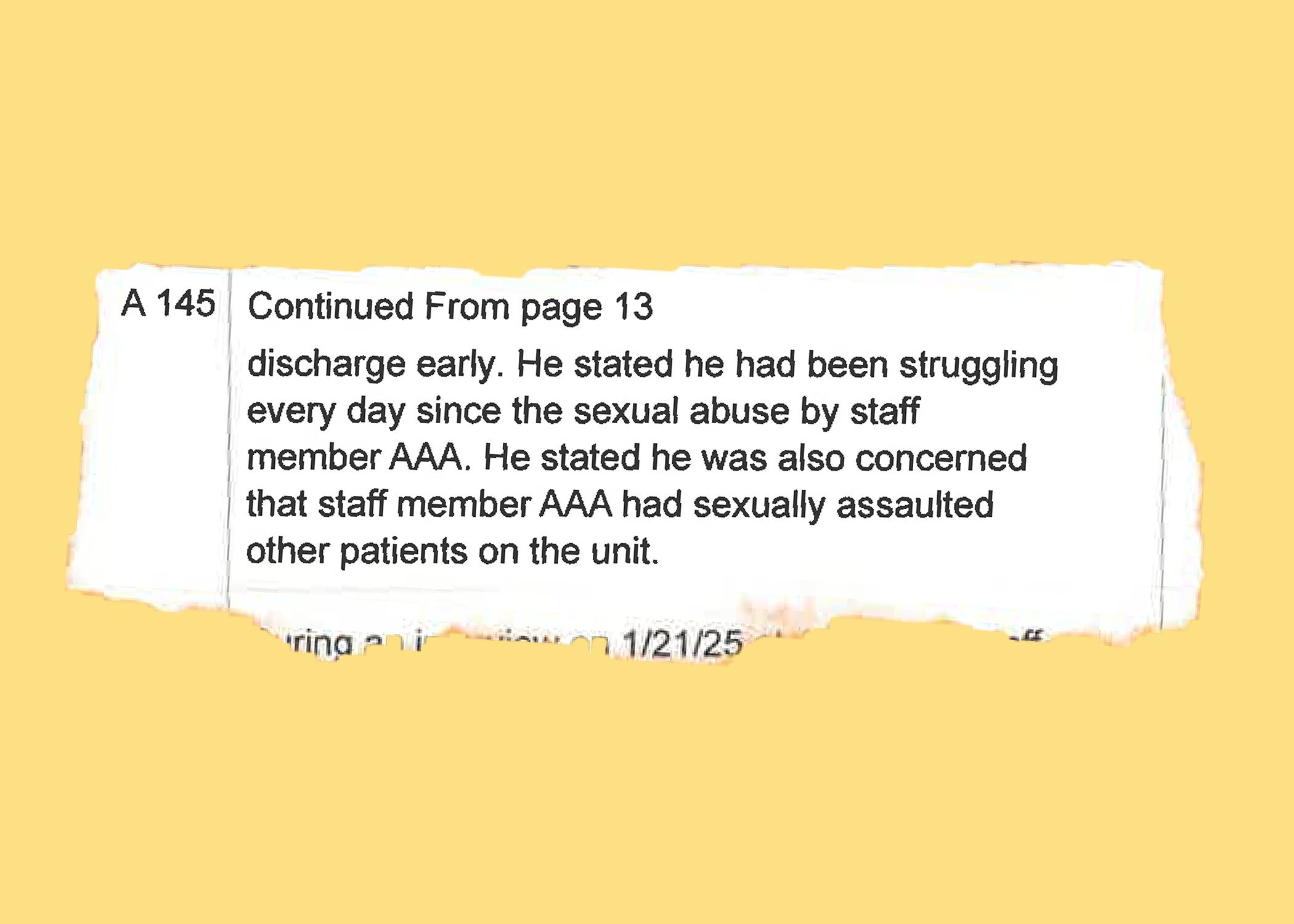 Federal inspectors spoke to the male patient who originally reported staff member AAA. In that conversation, the former patient “stated he had been struggling every day since the sexual abuse.” He also told investigators that he was “concerned that staff member AAA had sexually assaulted other patients on the unit.”