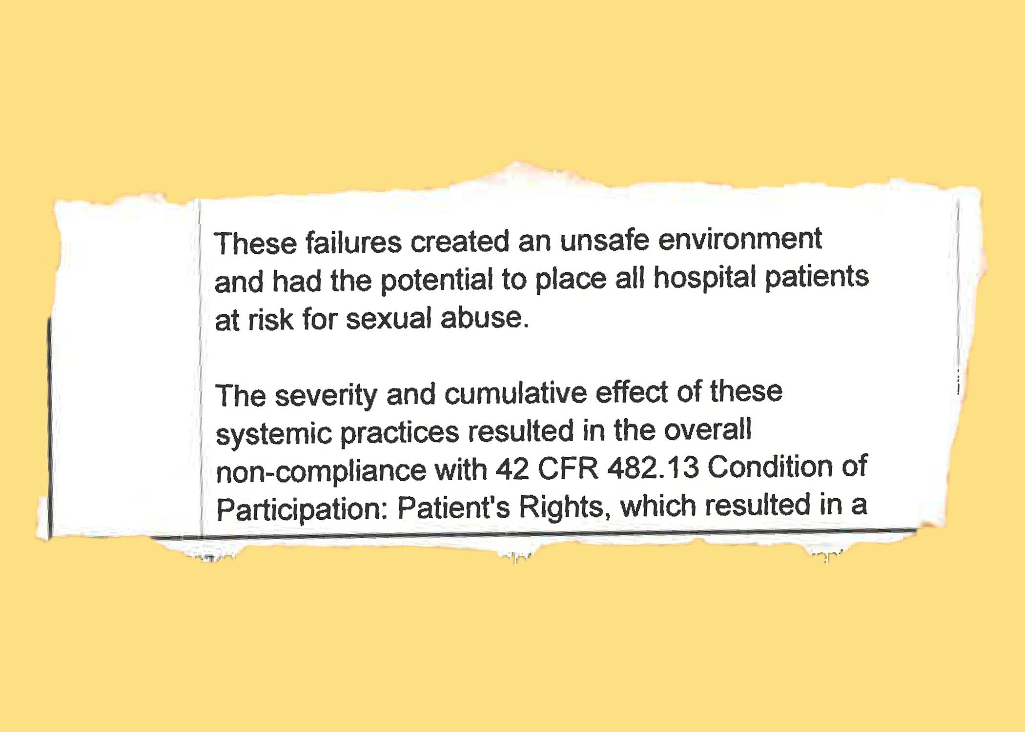 “These failures created an unsafe environment and had the potential to place all hospital patients at risk for sexual abuse,” the inspection stated.